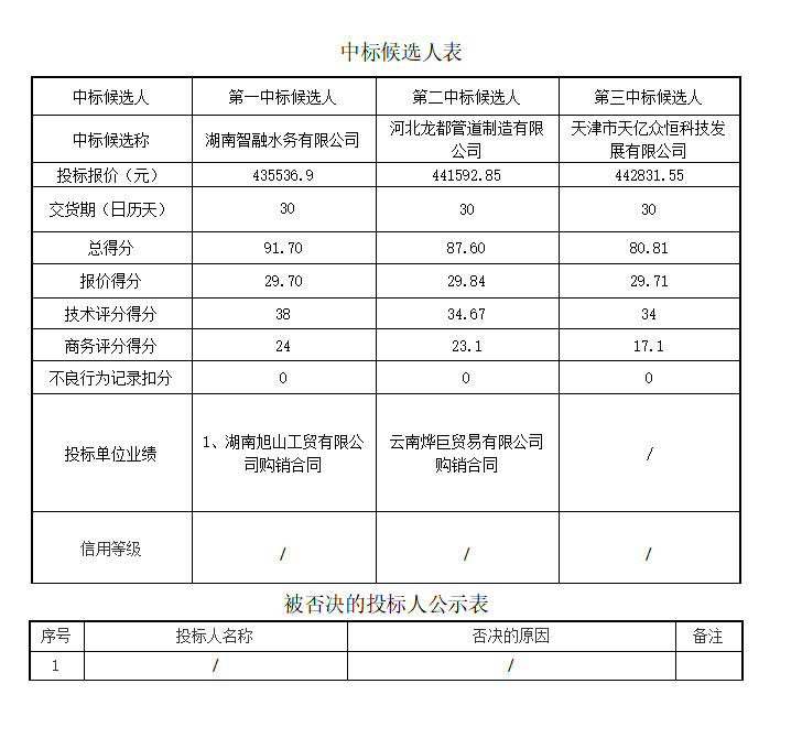******有限公司受江华瑶族自治县自来水公司的委托,代理江华瑶族自治县涔天河水厂农村管网延伸项目--大路铺镇水晶深村项目主材采购招标,于2025年10月09日15时00分(北京时间)在 ************委员会按照招标文件确定的评标原则和评标办法进行了细致的评审,并推荐本项目中标候选人排名如下表格:
