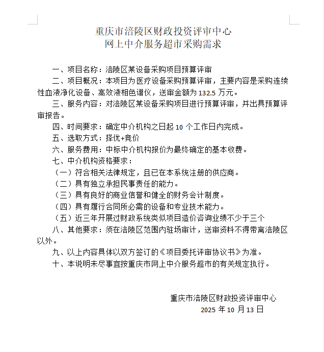 项目名称 | 涪陵区某设备采购项目预算评审 |