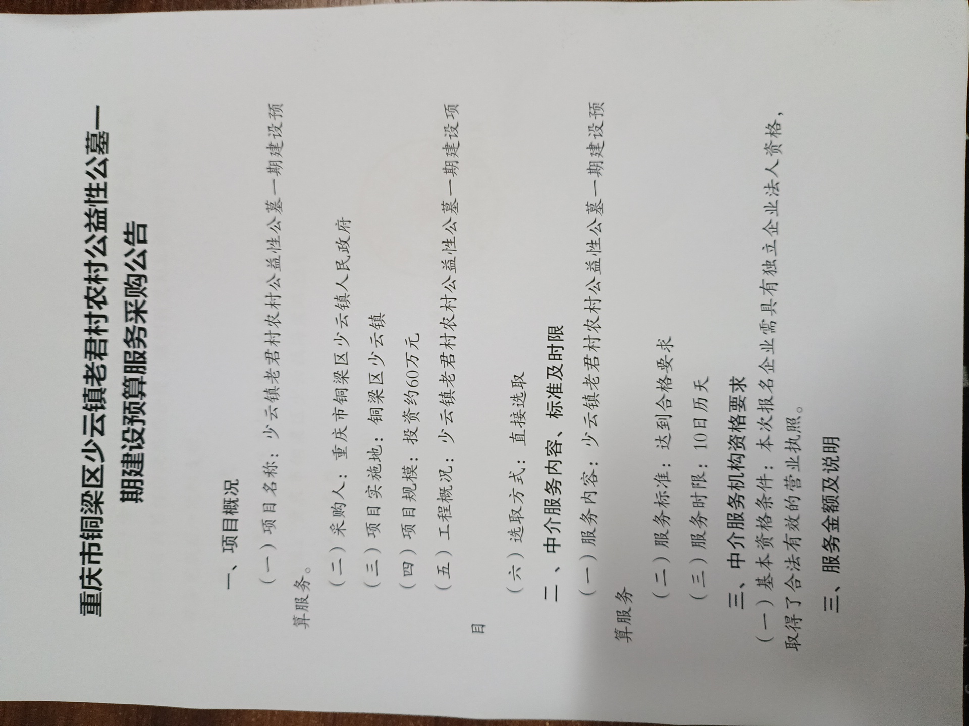 项目名称 | 重庆市铜梁区少云镇老君村农村公益性公墓一期建设预算服务采购 |