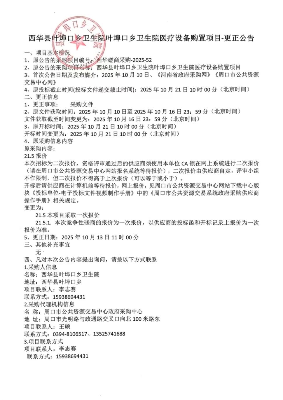 西华县叶埠口乡卫生院叶埠口乡卫生院医疗设备购置项目-更正公告