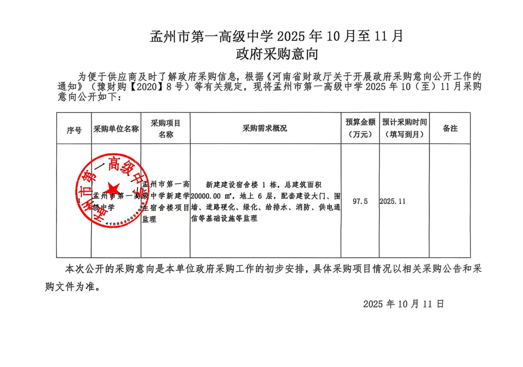 为便于供应商及时了解政府采购信息,根据《河南省财******中学 2025年10(至)11月采购意向公开如下: