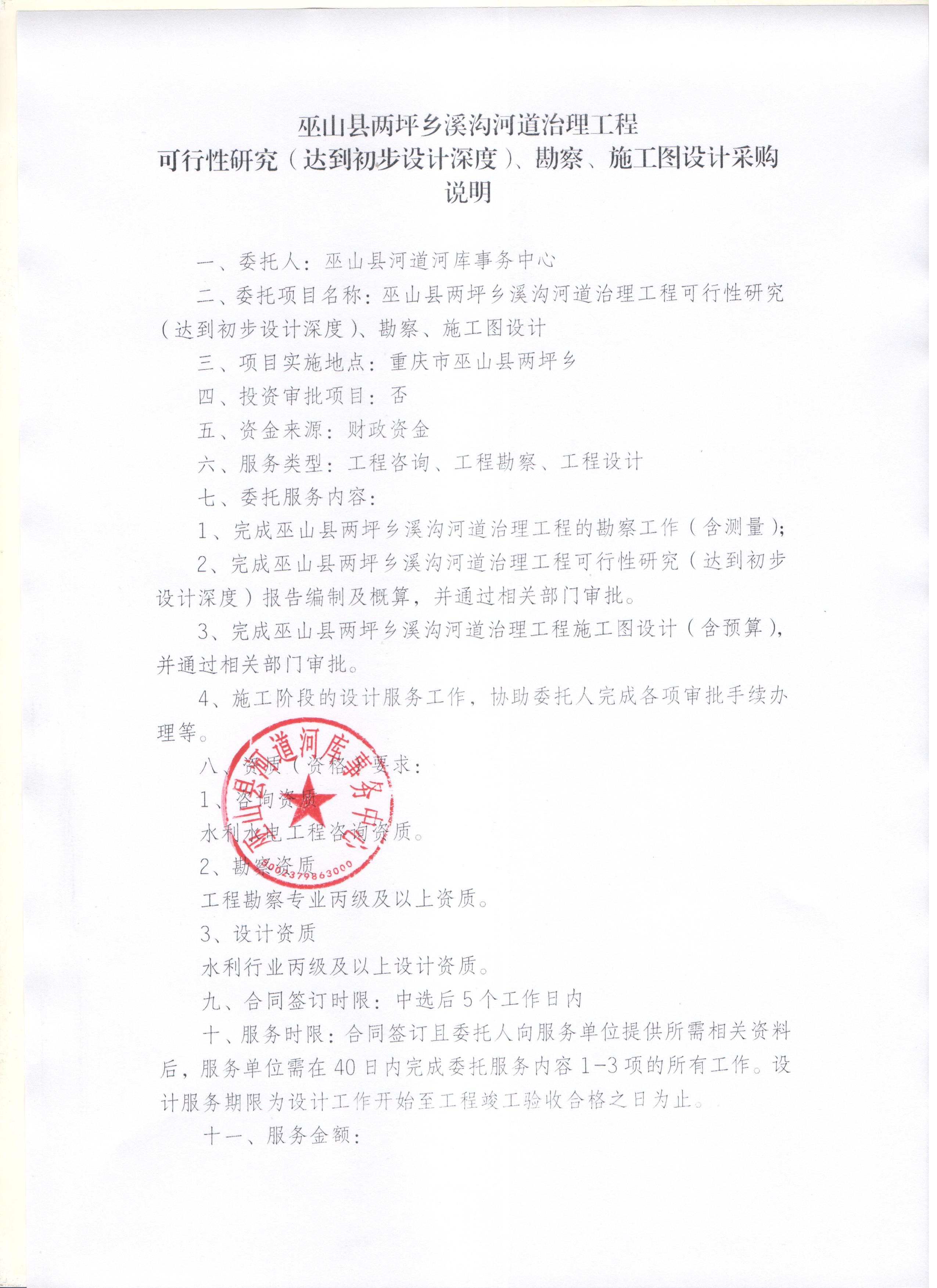 采购需求书下载 | 巫山县两坪乡溪沟河道治理工程可行性研究(达到初步设计深度)、勘察、施工图设计采购说明1.jpg 巫山县两坪乡溪沟河道治理工程可行性研究(达到初步设计深度)、勘察、施工图设计采购说明2.jpg |