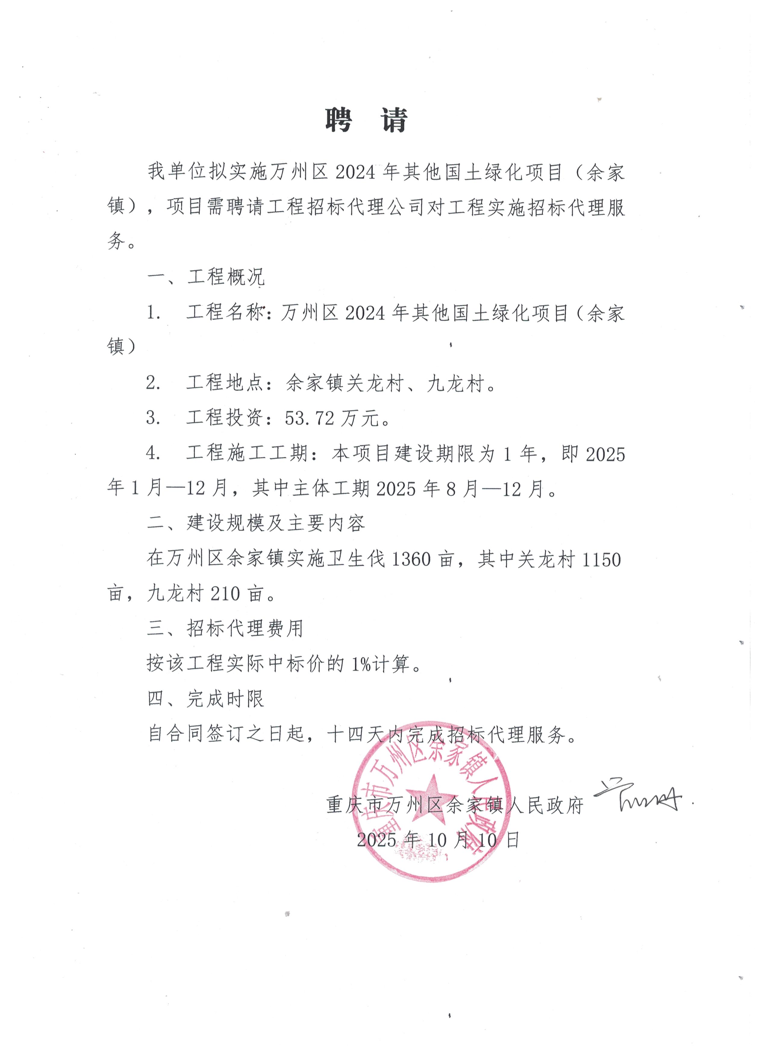项目名称 | 为万州区2024年其他国土绿化项目(余家镇)聘请工程招标代理公司 |