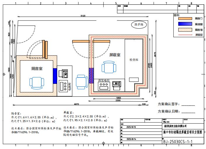 1 | 海口市琼山区文坛路6号医疗综合大楼三楼 | 约13.26平米(长约5.1米、宽约2.6米) | 1、隔音室技术要求:符合国家环保标准及声学标准GB/T16296.1-2018;2、屏蔽室技术要求:符合国家环保标准及声学标准GB/T16296.1-2018。屏蔽AM波,有效隔绝电磁信号干扰。 | 详见附图 |