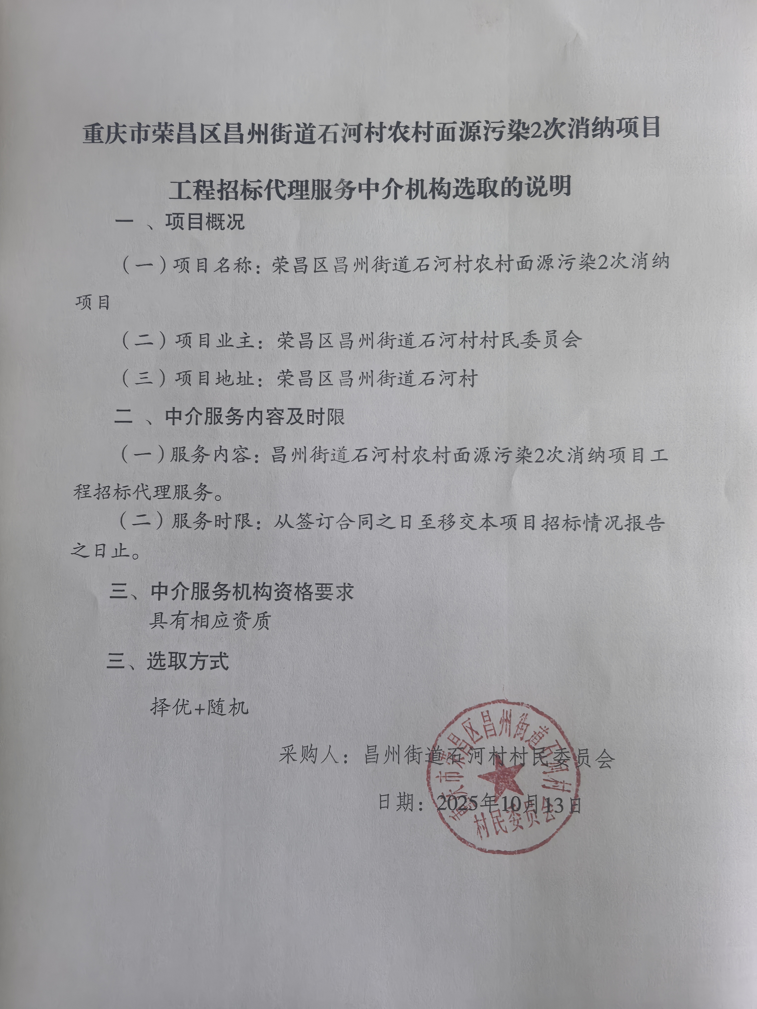 项目名称 | ******街道石河村农村面源污染2次消纳项目工程招标代理服务 |